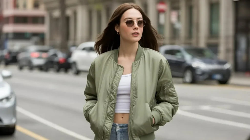 - Bomber Styles: A classic MA-1 flight jacket in sage green or black is a can’t-miss option. For a more luxe feel, try a satin bomber jacket. This adds a touch of sheen and elegance that can dress up the track pants significantly.