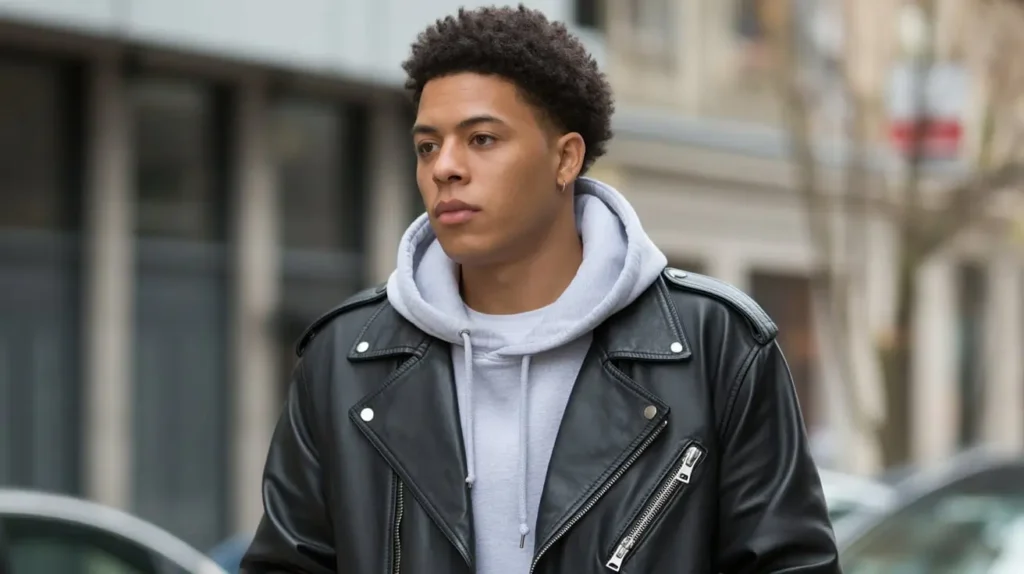 It’s a masterclass in texture mixing. You have the smooth, tough leather; the soft, cozy fleece of the hoodie; and the slick, sporty fabric of the track pants. These three distinct textures create a visually rich outfit that looks incredibly high-effort, even though it’s simple to assemble.