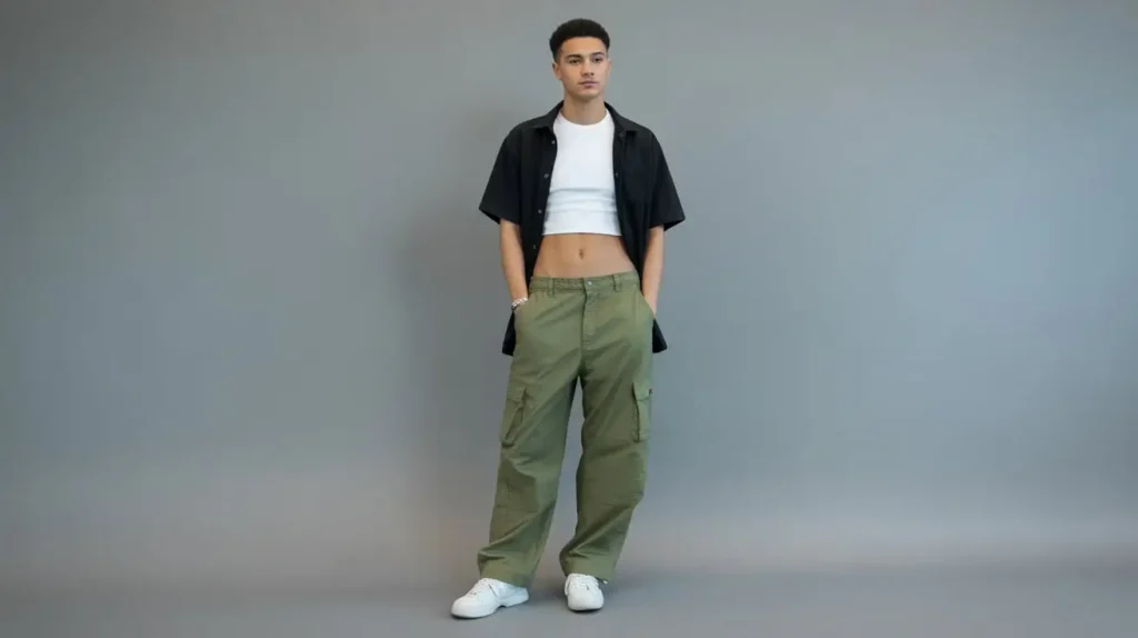 The goal is a distinct “big pants, little shirt” look. Your cargo pants should be loose and low-slung or high-waisted, depending on your preference. Look for styles in sturdy cotton or canvas that hold their shape. The tee, on the other hand, should be snug and hit at or above your natural waist. This contrast is what makes the outfit work so well.