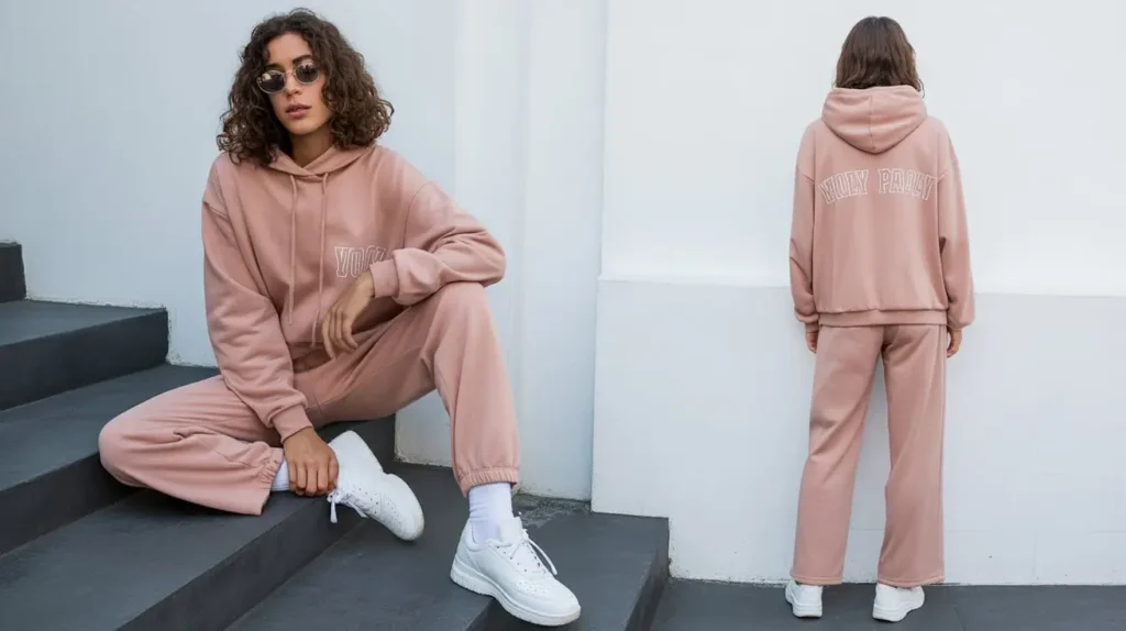 Both the sweatshirt and the sweatpants should be oversized and baggy. Look for sets in high-quality, thick cotton fleece in a sophisticated neutral color like oat, camel, forest green, or charcoal gray. The cut is everything—you want a relaxed, modern silhouette, not just a sloppy, standard-fit tracksuit.