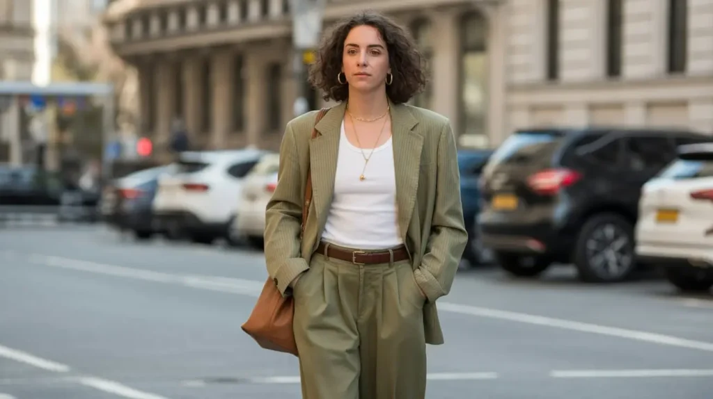 This might be my favorite look on the entire list. Why? Because it’s the ultimate power clash. It’s the “I have a 9 AM board meeting but also a 7 PM art gallery opening” outfit. The juxtaposition of a sharp, tailored blazer with relaxed, baggy trousers is pure sartorial genius.
