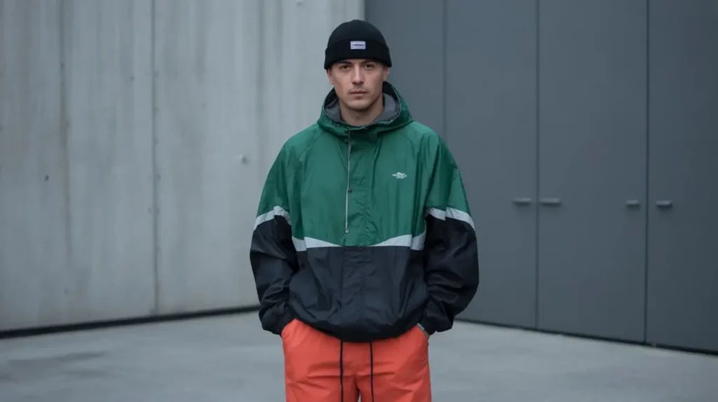 Pair it with pants that match the sporty energy. Parachute pants or track pants are the obvious choice here, as their nylon fabric complements the windbreaker. Baggy technical cargo pants or even light-wash baggy jeans can also create a cool, unexpected contrast.