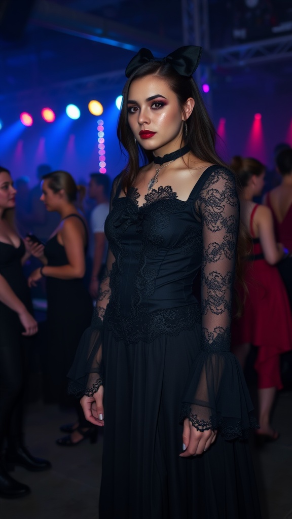 Feminine gothic styles stand out in the black rave scene, blending elegance and edginess. Picture a stunning outfit featuring intricate lace and flowing fabrics, creating a mysterious allure. The model in the image showcases a dark, ethereal look, perfect for the dance floor.