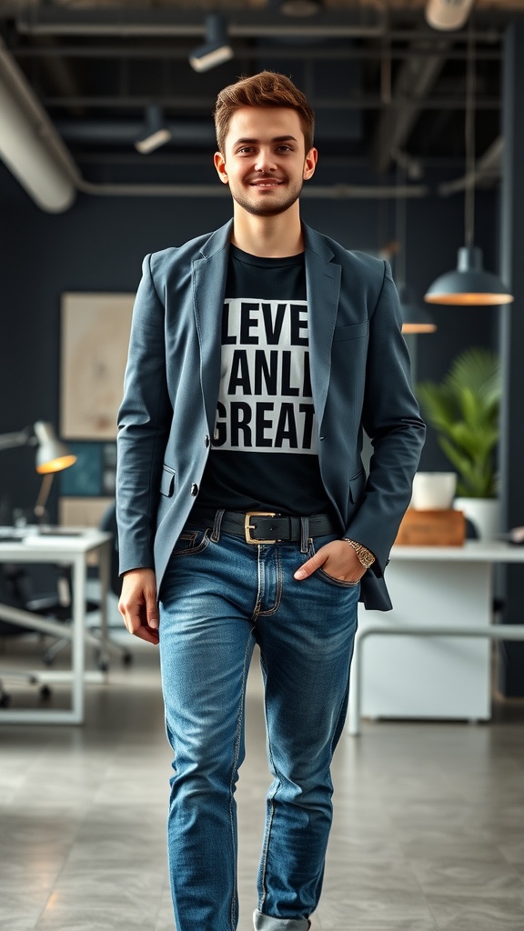 The graphic tee and blazer combo is a stylish choice for business casual. This look strikes a balance between relaxed and polished. The model showcases a bold graphic tee that adds personality while the blazer elevates the outfit.