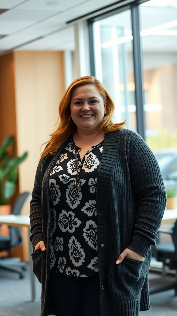 Layering is a fantastic way to create a polished yet comfortable look for any occasion. A stylish cardigan or sweater can be the perfect addition to a business casual outfit, especially for plus-size individuals. In the image, we see a confident woman showcasing this concept beautifully.