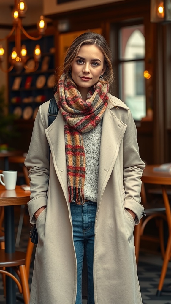 Underneath, a cozy knit sweater adds warmth without bulk. This piece is versatile, looking great on its own or under a jacket. The addition of a plaid scarf adds a pop of color and extra insulation, making it easy to adapt to different climates throughout the day.