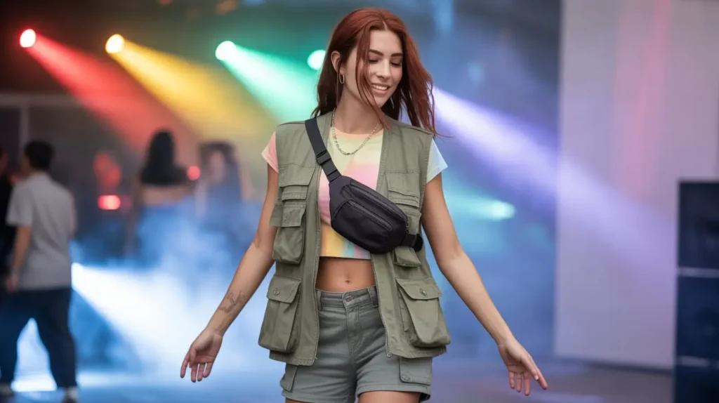 Utility vests are also gaining popularity for their versatility. They offer multiple pockets to store essentials like phones, wallets, and even snacks. The individual in the image pairs their fanny pack with a utility vest, creating a cool layered effect. This combination allows for easy access to belongings while keeping hands free to enjoy the beats.