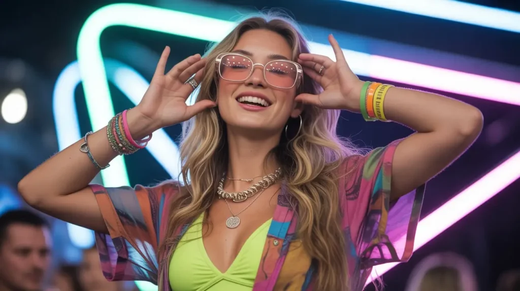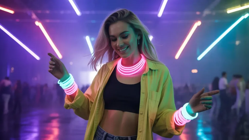 LED accessories bring a fun and exciting element to any casual rave outfit. They light up the dance floor and help you stand out in the crowd. In the image, you can see a person wearing bright LED necklaces, creating a stunning visual effect.