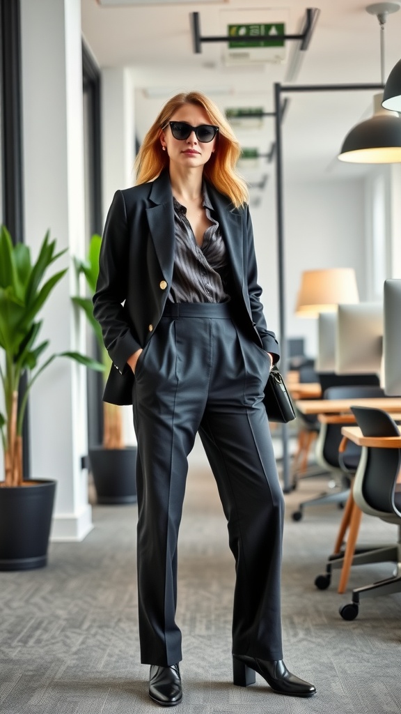 Jumpsuits are a fantastic option for anyone looking to blend comfort with style. The image captures a chic individual wearing a black jumpsuit paired with a tailored blazer, creating a polished yet relaxed look. This ensemble is perfect for a day at the office or a casual meeting.
