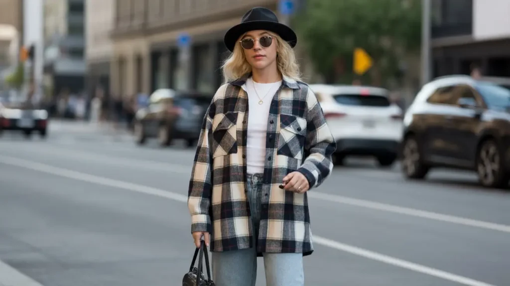 - The Shacket: The star of the show! Look for a plaid shacket in a versatile color combination, like brown and cream, grey and black, or muted greens. An oversized fit is essential for that cool, borrowed-from-the-boys look. Wool-blend fabrics will give you the most warmth and structure.