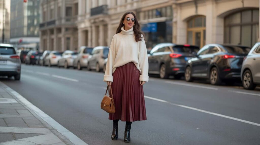 - The Midi Skirt: You have so many options here! A satin or silk slip-style midi skirt creates a beautiful contrast in textures against a knit turtleneck. A pleated midi skirt adds movement and a touch of classic elegance. For extra warmth, a wool or knit midi skirt is a fantastic choice.