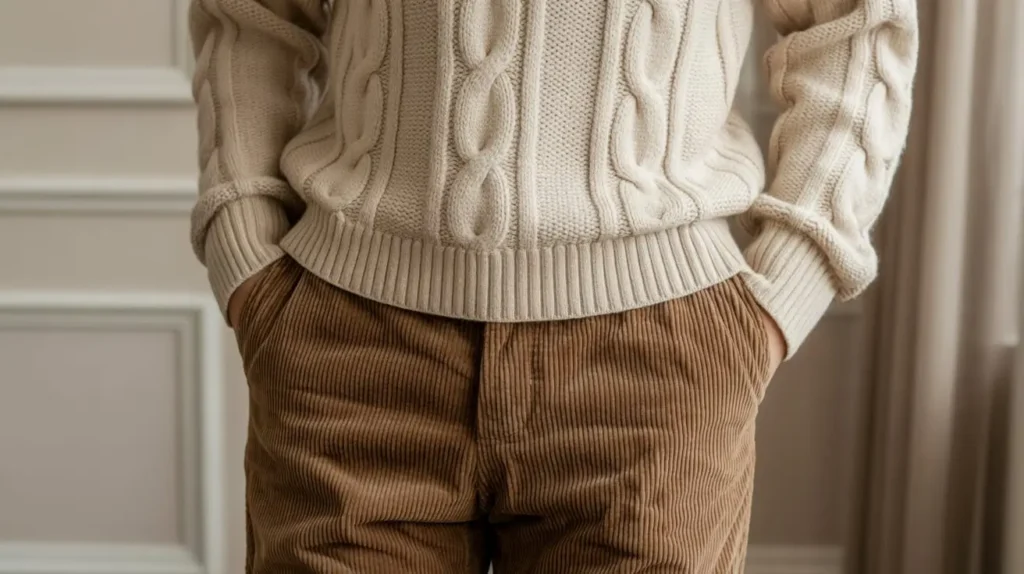 - The Sweater: A classic cream or navy cable knit sweater is the perfect partner for corduroy. The intricate pattern of the knit adds visual interest and a timeless, cozy feel. A crewneck or a turtleneck style both work beautifully.