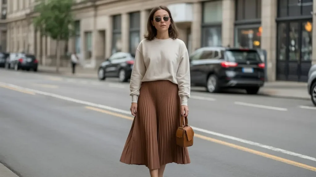 This look is amazing with a silky, satin slip-style midi skirt. The contrast between the matte, soft cotton of the sweatshirt and the slinky, shiny fabric of the skirt is just stunning. A pleated midi skirt also works beautifully.