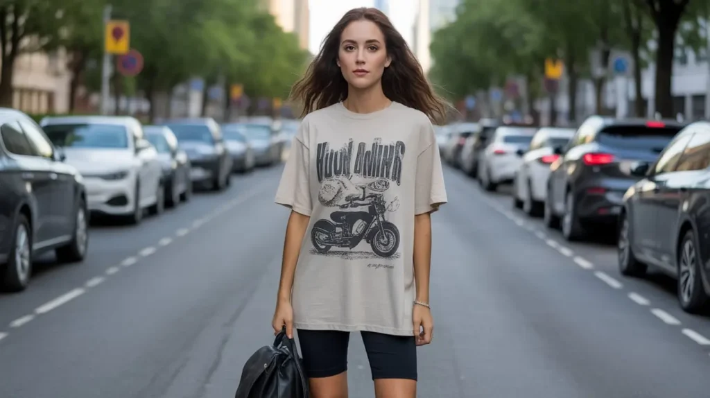 - Oversized is Key: Opt for an oversized or at least a relaxed-fit graphic tee. The baggy top balances the form-fitting nature of the shorts.