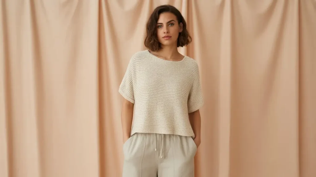 Pairing them with a soft knit top—like a fine-gauge sweater, a ribbed tank, or a simple cotton knit tee—keeps the entire outfit feeling soft and comfortable. The knit fabric provides a lovely textural contrast to the crispness of the linen.