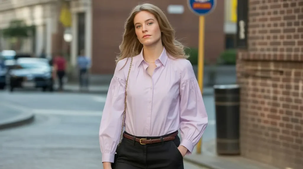 - Puffy sleeves, ruffles, or a pussy-bow neckline.