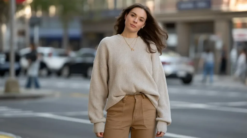 The key to making this look chic, not sloppy, is the sweater itself. A chunky, cable-knit sweater or a soft cashmere or merino wool knit elevates the entire outfit. Opt for sweaters in neutral tones like cream, oatmeal, camel, or grey for a sophisticated palette.
