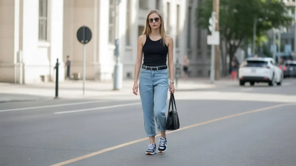 - Interesting Silhouettes: Chunky “dad” sneakers, retro runners, or hyped-up collaborations will instantly elevate the simple tank and pants.