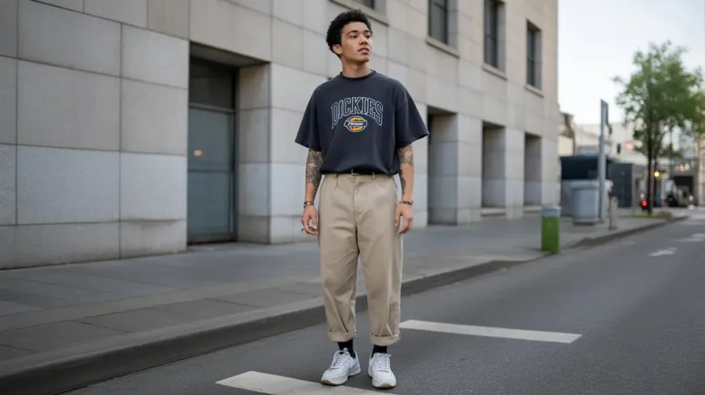 What about skinny-fit Dickies? I’d steer clear. Pairing a huge top with super-tight pants can create an unbalanced, “lollipop” effect. We’re going for effortlessly cool, not a cartoon character. 🙂
