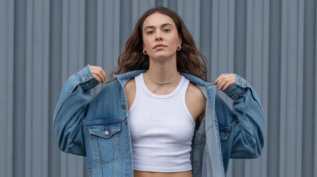 Start with a simple base layer. A white or black tank top is perfect. You can go for a classic ribbed “wife-pleaser” style for a bit of a grunge feel or a simple scoop-neck cotton tank for a cleaner look. The tank top serves as a neutral canvas, allowing the jacket and pants to be the main focus.
