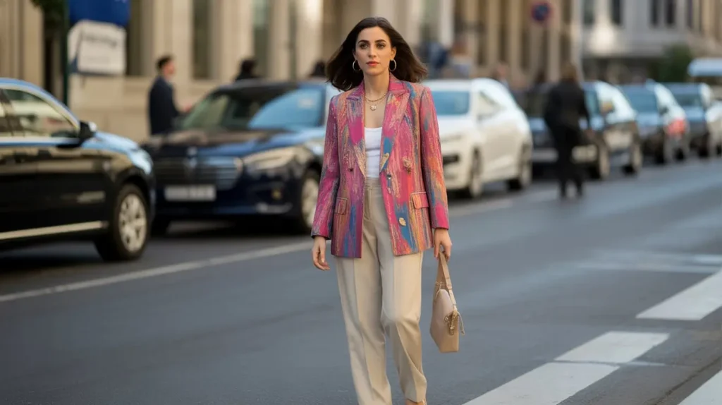 A vivid printed blazer paired with neutral trousers or skirt ensures the outfit remains balanced while standing out. Pairing with understated shoes allows the blazer to be the centerpiece. Ideal for making a confident statement in crowded fashion week environments.