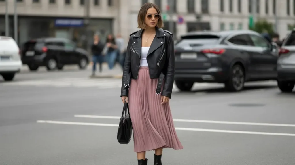A cropped leather moto jacket paired with a flowing pleated skirt creates a striking mix of edgy and feminine vibes. The contrast between structured leather and soft fabric adds depth and movement to the outfit. Finish the look with ankle boots and subtle jewelry for a modern runway-ready style.