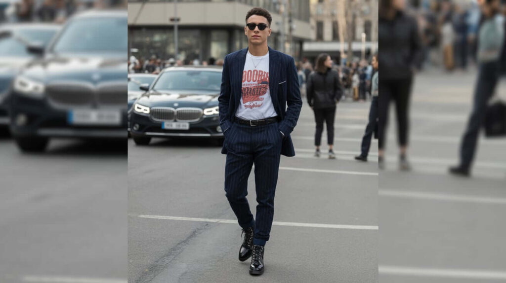Pairing a graphic tee with a sharp blazer balances casual and sophisticated elements. Slim-fit trousers or skirt keep the look runway-appropriate. Accessories like sleek boots or statement glasses add modern flair.