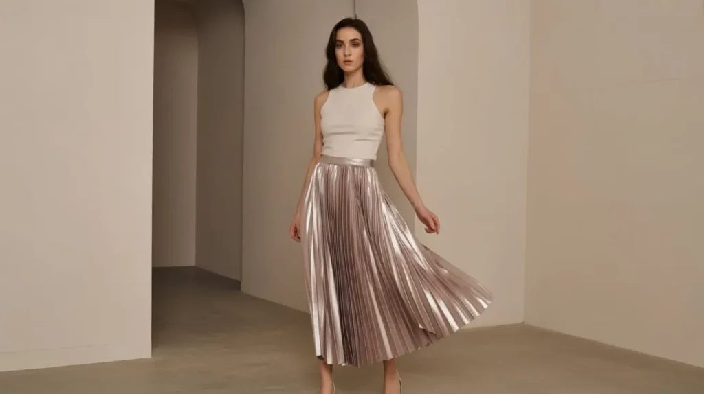 A flowing metallic pleated skirt paired with a simple fitted top creates elegance with subtle drama. The reflective skirt catches light during movement, making it perfect for runway photos. Simple heels or flats complete the minimalist-yet-striking outfit.