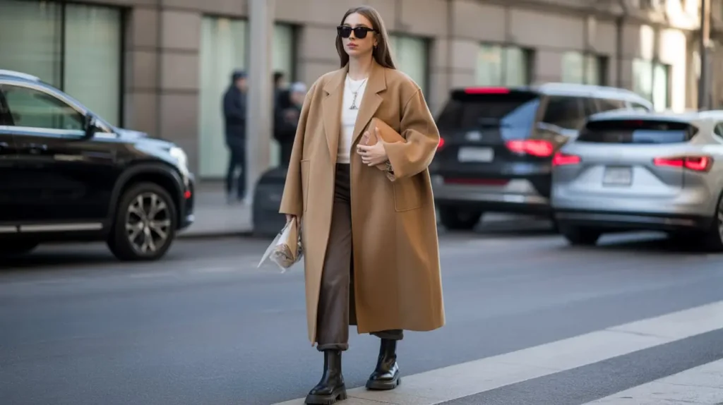 An oversized coat worn over fitted skinny pants delivers a bold yet approachable fashion statement. Pairing it with chunky boots or stylish sunglasses adds a modern street-style vibe. This combination keeps you comfortable during long Fashion Week events while making a dramatic impression.