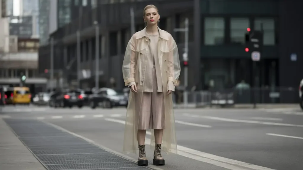 A sheer trench coat layered over solid undergarments and tailored pants provides a modern, fashion-forward aesthetic. This layering allows experimentation with textures and colors while keeping the overall look sleek. Complement with ankle boots or platform shoes for added edge.