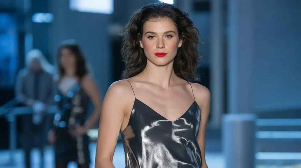 A metallic slip dress drapes smoothly over the body, creating movement and reflecting light beautifully. Paired with heeled boots, this outfit balances glamour with a subtle edge, perfect for runway events or evening fashion parties. Minimal accessories and bold makeup complete the futuristic yet elegant appearance.