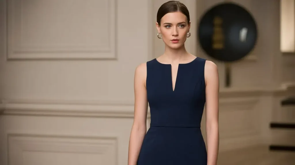 A sheath dress hugs the body with a clean, streamlined silhouette and a modest neckline. Knee-length or slightly longer, it exudes modern sophistication. Minimalist accessories and classic shoes complete the polished look suitable for professional or formal events.