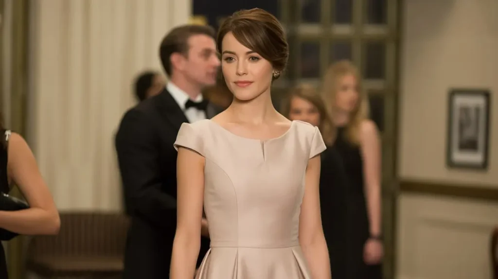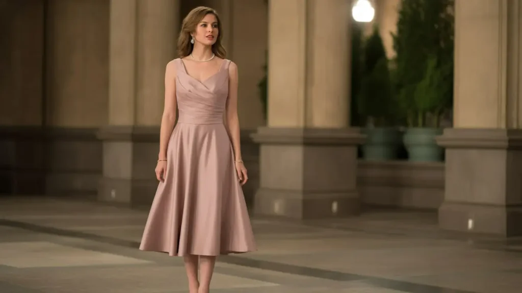 Cap-sleeve dresses provide subtle shoulder coverage with a tailored bodice and flared skirt. The modest silhouette works for professional events, semi-formal dinners, or daytime ceremonies. Soft accessories maintain a polished, elegant look.