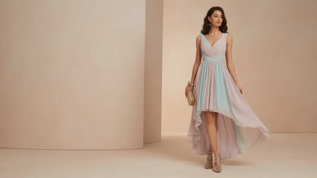 High-low dresses have a hemline shorter at the front and longer at the back, creating visual interest and movement. Fabrics like chiffon or satin provide graceful flow when walking. Perfect for evening parties, weddings, or semi-formal events.
