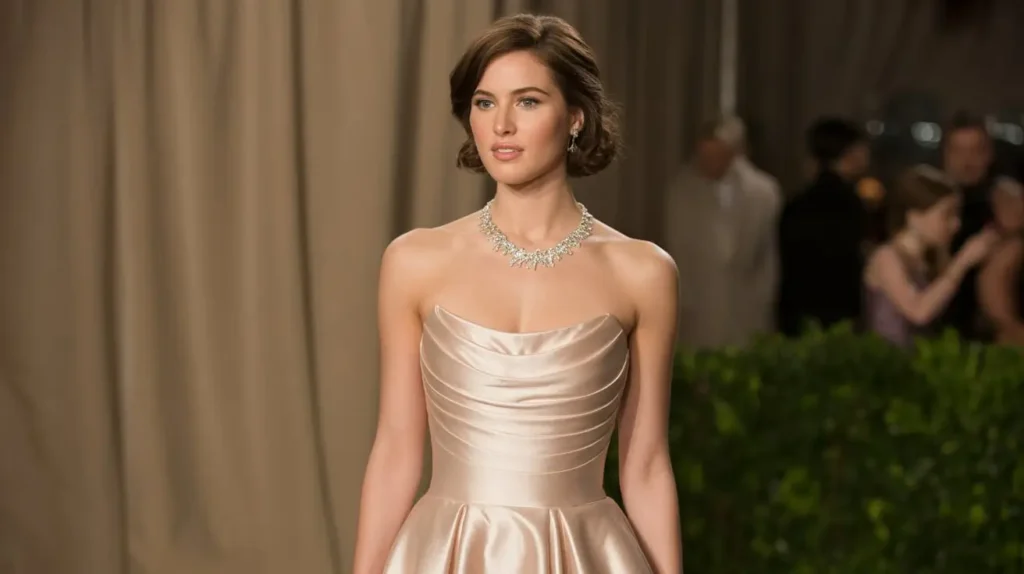 Strapless gowns highlight shoulders and collarbones while featuring a fitted bodice with a flowing skirt. Minimal jewelry completes the elegant look. Ideal for galas, evening weddings, or high-end formal parties.