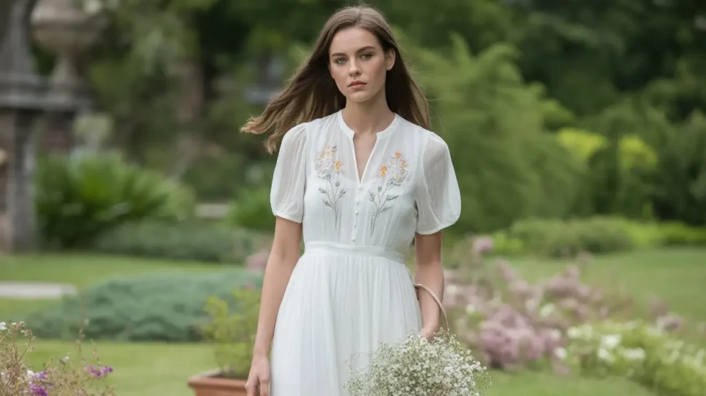 A white dress with subtle floral embroidery adds texture and gentle sophistication. Lightweight fabrics enhance movement and keep the look celebratory. Perfect for spring graduations or outdoor ceremonies.