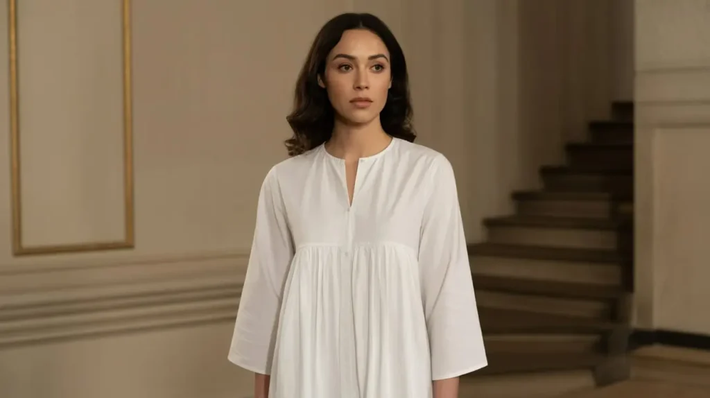 A white tunic-style outfit with a slightly fitted upper body and a flowing lower section creates a sleek yet relaxed silhouette. Lightweight fabrics like cotton or linen allow for ease of movement and a polished, ceremonial appearance. Pair it with slim white trousers or churidar pants for a modern, formal graduation-ready look.