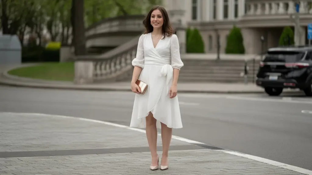 A white wrap dress with a tied waist forms a flattering V-neckline and elegant drape. Pair with block heels and a clutch for a chic graduation-ready outfit. Suitable for graduates seeking comfort with a stylish touch.