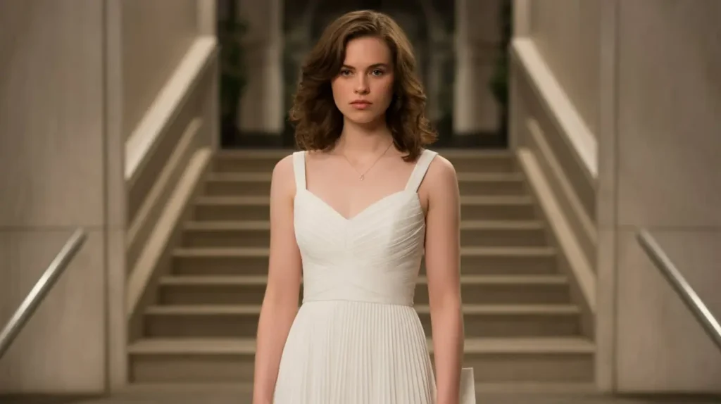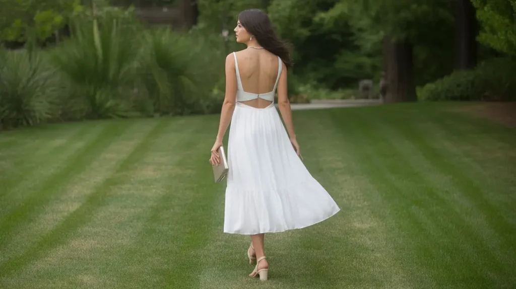 A white dress with an open or low back paired with a fitted bodice and flowing skirt creates subtle elegance. Minimal accessories and neutral shoes complete the look. Ideal for warm weather ceremonies or celebratory events.