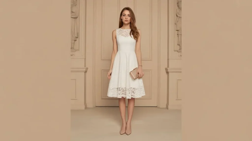 A white fit-and-flare dress with lace accents on the bodice and hemline balances structure and femininity. Pair with nude pumps and a delicate clutch for graduation events. Ideal for graduates who enjoy classic yet modern styles.