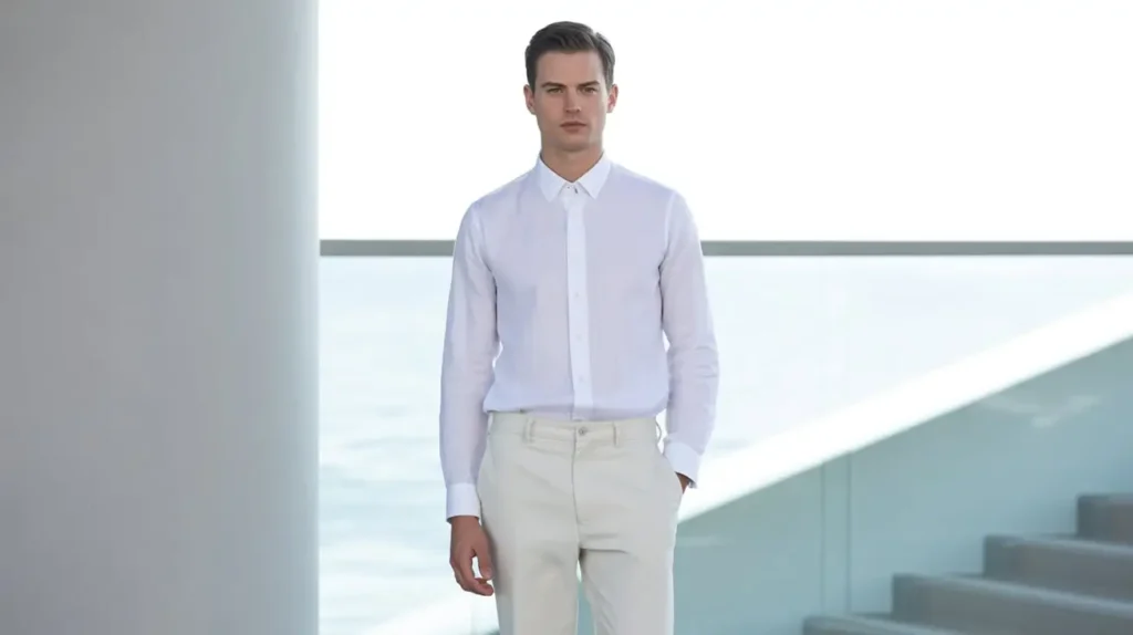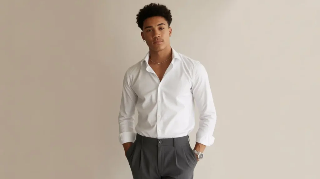 A crisp white fitted shirt paired with tailored white trousers creates a sleek and sophisticated graduation look. Minimal accessories like a classic watch or cufflinks complete the polished outfit. Perfect for graduates who prefer a clean, modern, and refined style.