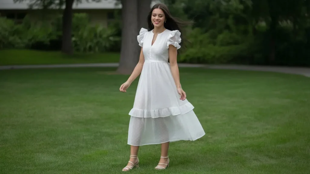 A white dress with tiered ruffles on the skirt or sleeves introduces playful volume and movement. Pair with strappy heels and subtle jewelry for a graduation-ready appearance. Perfect for lively celebrations and memorable photos.