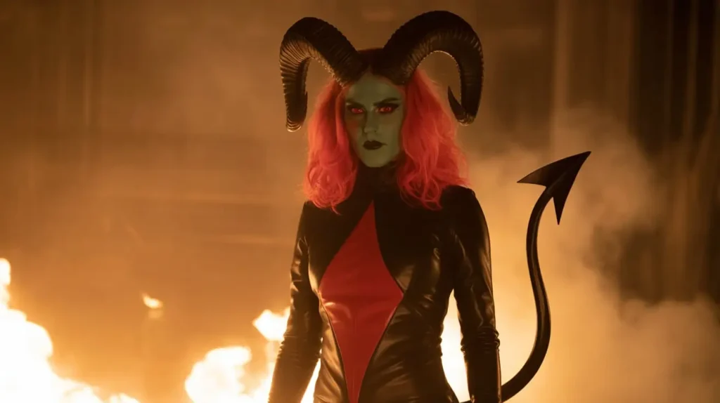 A red or black fitted outfit paired with horns, tail, and dramatic makeup creates a seductive yet dark Halloween costume. Add gloves, boots, and accent jewelry to enhance the supernatural effect. Ideal for fantasy or adult-themed Halloween events.