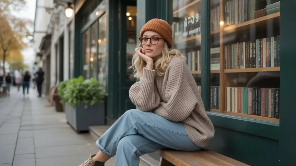 An oversized knit sweater paired with relaxed-fit mom jeans and a slouchy beanie creates a cozy, effortlessly cool hipster outfit. Sneakers or ankle boots complete the look, perfect for casual strolls or weekend outings. Accessories like retro glasses add a finishing touch.