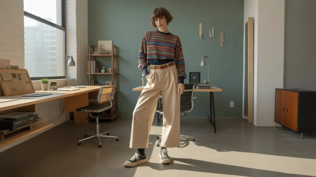 Pair a colorful striped sweater with high-waist wide-leg pants for a retro, playful look. Sneakers or platform shoes work best, and small vintage accessories enhance the hipster feel. This outfit suits urban explorations or casual outings.
