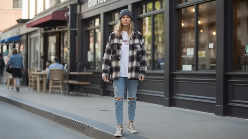 Why it works: Oversized flannel adds casual comfort while distressed jeans bring modern, edgy style.