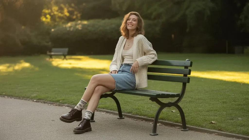 A chunky knit cardigan over a tucked-in top paired with high-waist shorts balances cozy and chic. Add patterned socks, ankle boots, or sneakers. This look works for cooler days and outdoor brunches.