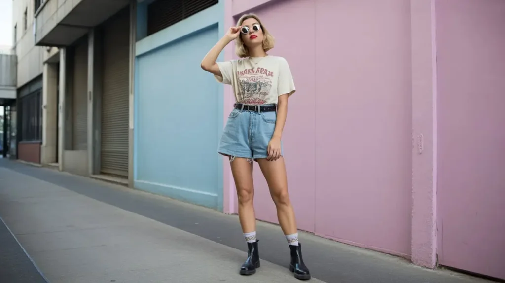 A vintage graphic tee tucked into high-waist denim or corduroy shorts creates a retro hipster feel. Add patterned socks, ankle boots, or sneakers for a playful touch. Accessories like round sunglasses or a slouchy hat complete the street-style look.