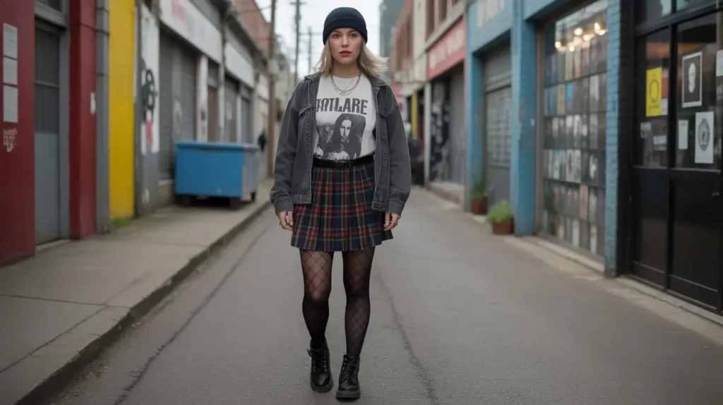A vintage band tee tucked into a plaid mini or midi skirt creates a grunge-hipster fusion. Layer with tights, combat boots, or loafers, and accessorize with layered necklaces or a beanie. This style is perfect for concerts, coffee dates, or urban explorations.