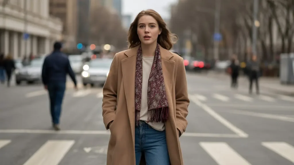 A vintage or thrifted coat layered over a simple top and jeans, paired with a patterned scarf, creates a timeless hipster look. Add ankle boots or sneakers to complete the outfit. Ideal for colder weather while maintaining street style aesthetics.